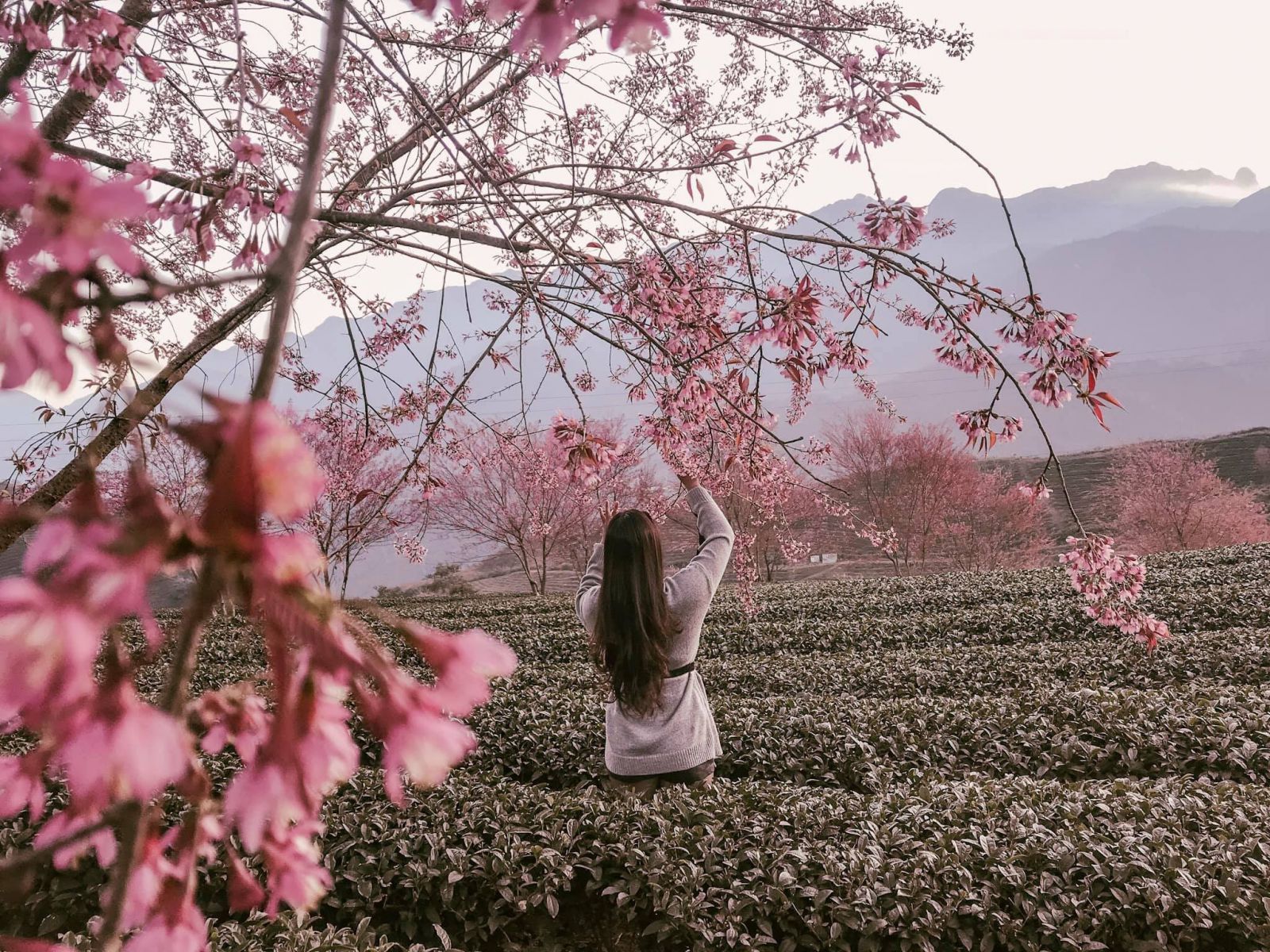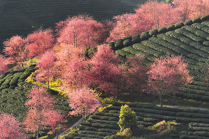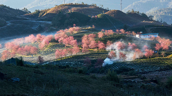 Cộng đồng mạng đang khiến giới dịch chuyển “phát sốt” với những bức hình đồi chè Ô Long ngợp ngời sắc hoa mai anh đào hồng rực. Nằm cách thị xã Sa Pa khoảng 8km về hướng Tây Bắc, đồi chè này đang là địa điểm “sống ảo” số 1 tại Sa Pa.