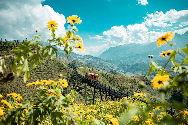 Không chỉ có hoa mai anh đào, triền hoa dã quỳ gần ga tàu hoả leo núi Mường hoa thuộc khu du lịch Sun World Fansipan Legend cũng đang toả sắc vàng sáng rực một vùng. Dã quỳ trên Sa Pa nở muộn vào cuối tháng 11 và chỉ rộ nhất trong khoảng 10 đến 14 ngày. Hiện tại chính là thời điểm hoa đang đẹp ngợp ngời nhất nên hội mê chụp ảnh nếu muốn bội thu cả mai anh đào và dã quỳ thì cần lên lịch đi Sa Pa ngay và luôn.